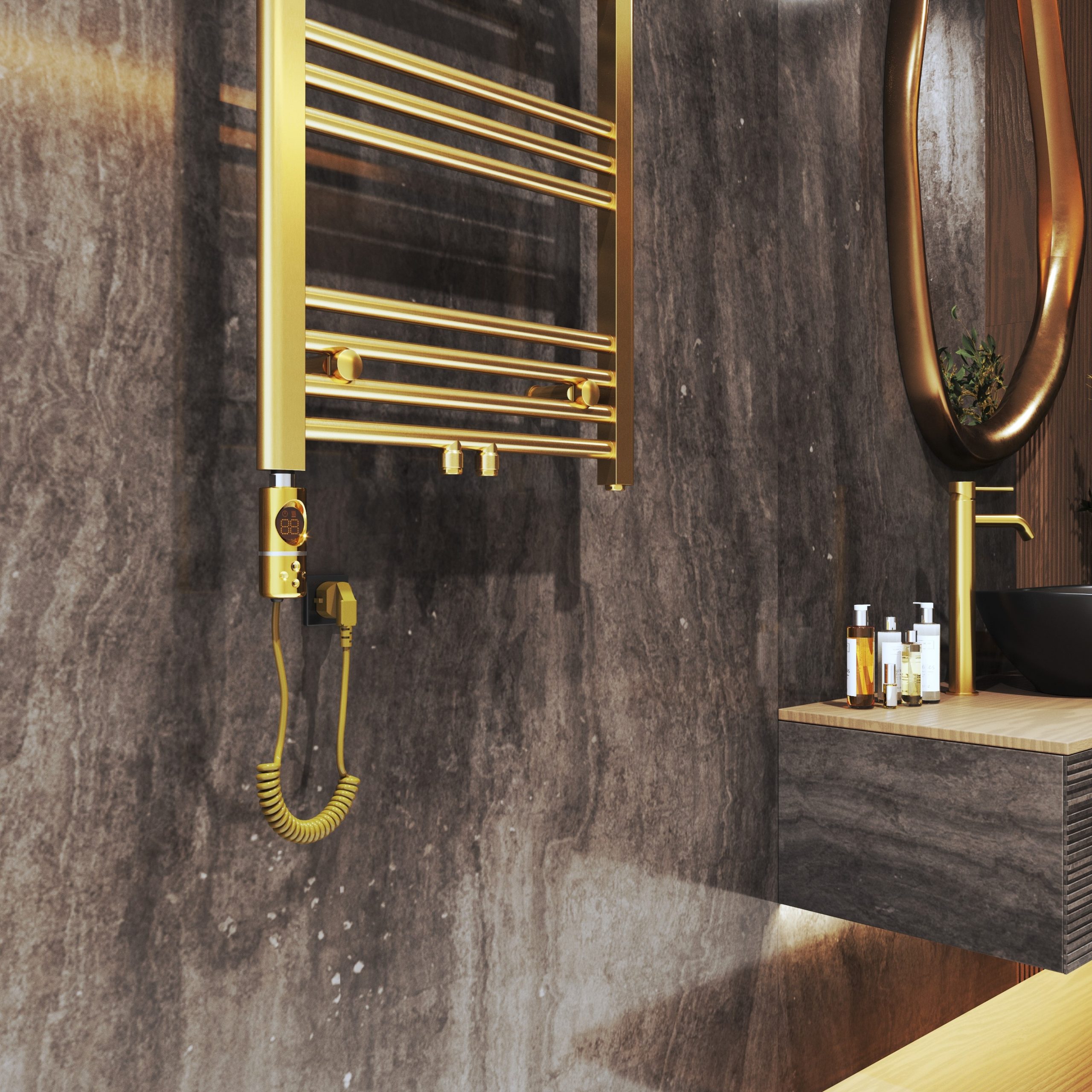 Grzałka E-Flow Brushed Gold to nowoczesne rozwiązanie, które łączy zaawansowaną technologię z wyjątkowym designem. Jej eleganckie, szczotkowane złote wykończenie doskonale komponuje się z nowoczesnymi grzejnikami łazienkowymi, nadając wnętrzu luksusowy i harmonijny charakter. Urządzenie wyróżnia się minimalistyczną formą oraz intuicyjną obsługą, dzięki czemu codzienne korzystanie z niego jest niezwykle wygodne i przyjemne.