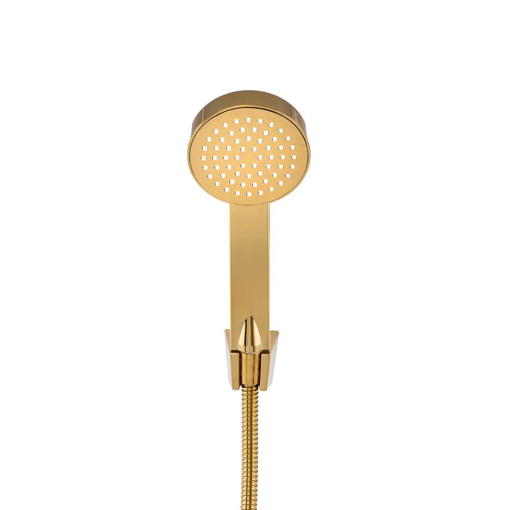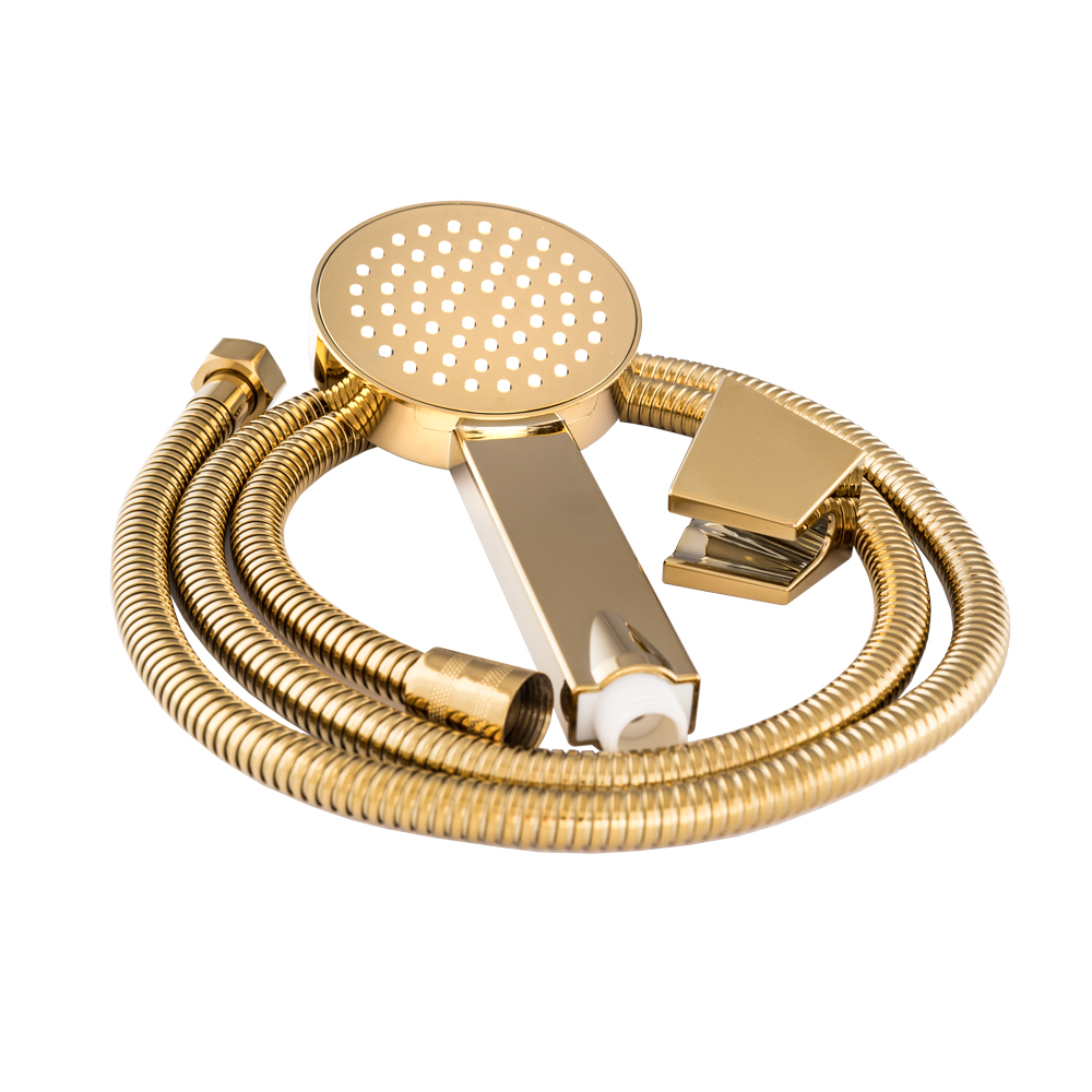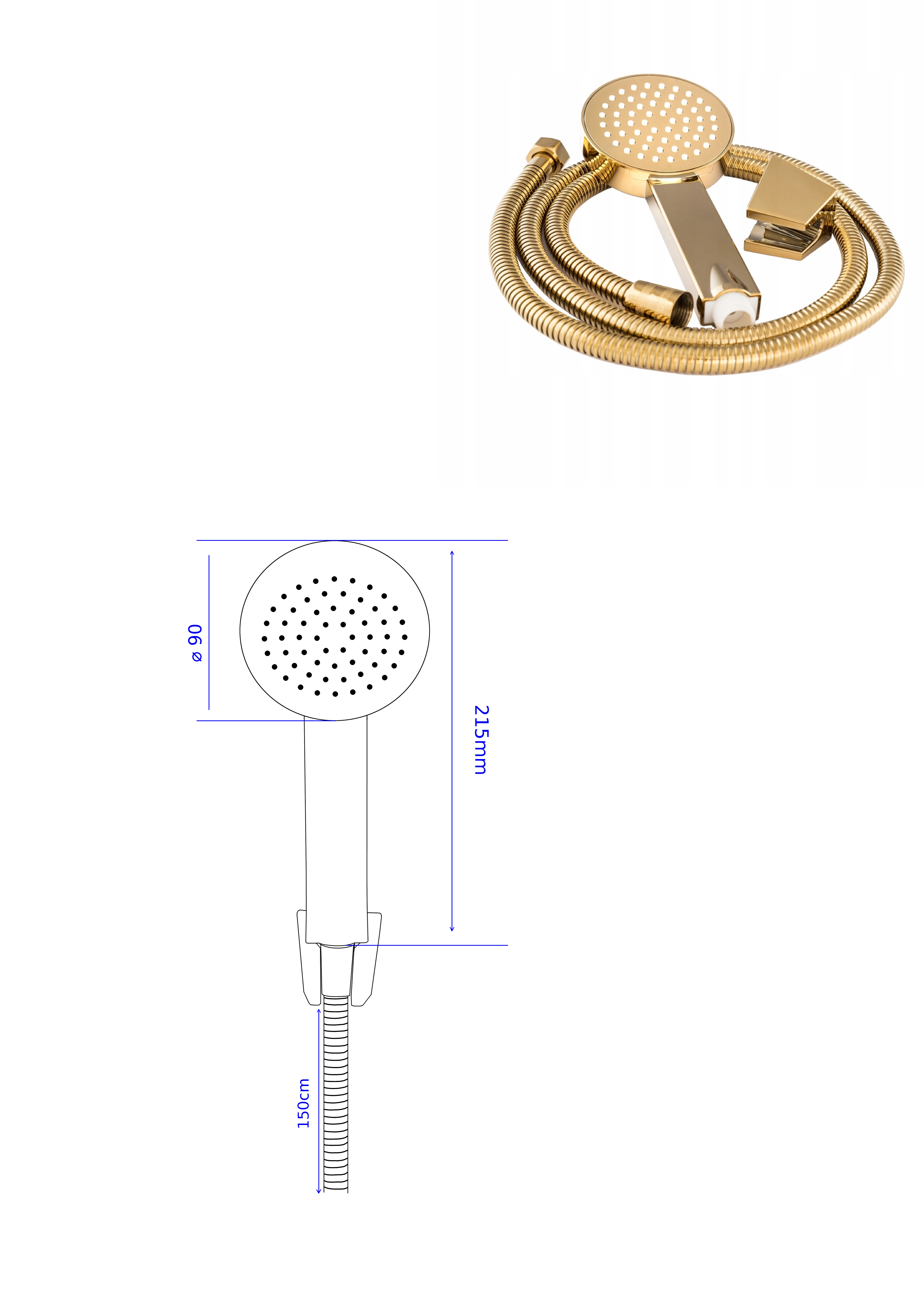 Zestaw prysznicowy w złotym wykończeniu to elegancka propozycja dla osób ceniących luksusowy design w swojej łazience. Komplet składa się z węża prysznicowego, słuchawki oraz uchwytu ściennego, wszystkie elementy utrzymane w jednolitej, złotej kolorystyce.